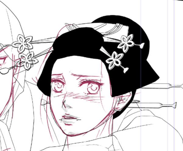 ツヤベタも本当にただのツヤベタだけなら自分でやってしまいたいのですが、このように3D鬘を元に、髪飾りなども描いていったりするので、毎月連載ではアシスタントさんにお願いをしないと間に合いません^^;