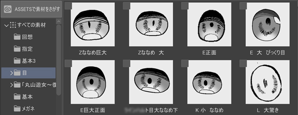 瞳も人物別に描くたびに保存をしていて、もうトーン化したときにグラデーションになるようにアクションも作ってあります。